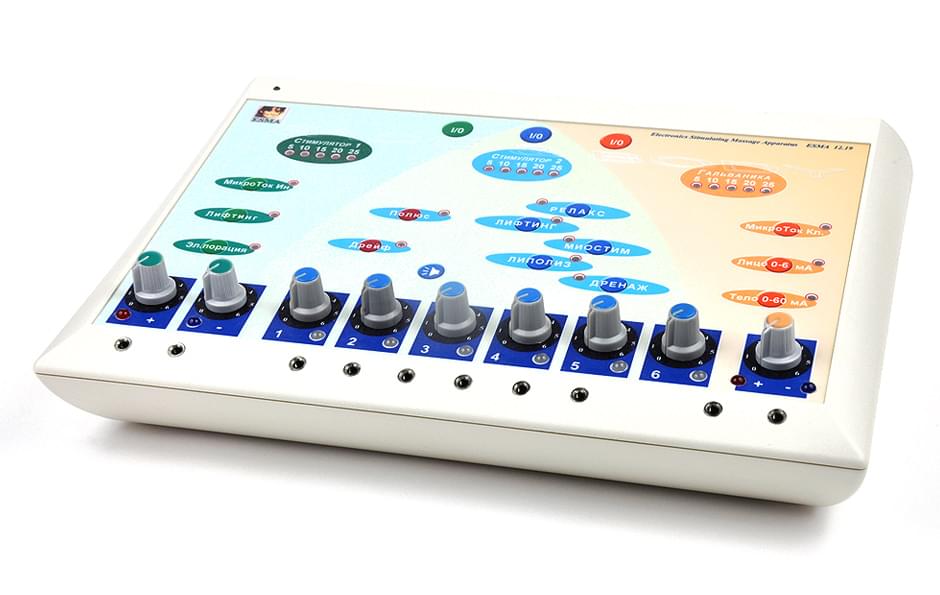 ЭСМА 12.19 ЛОТУС - новейший многофункциональный физиотерапевтический комплекс. ЛОТУС - уникальный и единственный аппарат на рынке, способный одновременно воздействовать импульсным и постоянным током (гальванизация). Аппарат одновременно выполняет до 3 независимых, программируемых процедур: электроимпульсная терапия лицо, электроимпульсная терапия тело, гальванизация (лицо 0-6 мА, тело 0-60 мА). Наличие различных видов тока позволяет проводить два типа микротоковой терапии: классический микроток на частоте до 650 мкА и интерференционный, глубокого и эффективного проникновения. Аппарат располагает всем перечнем процедур по электростимуляции, а также дополнительными режимами: интерференционный ток*, электропорация. ЛОТУС имеет 10 (2+6+2) независимых каналов, с подключением до 32 электродов. *Интерференция – перекрестное наложение двух токов различной частоты, при котором образуется новый высокоактивный ток с эффектом глубокого проникновения в ткани и последующего воздействие на них. Интерференция обеспечивает интенсивную стимуляция глубоко подлежащих тканей, при этом возникает малый раздражающий эффект на поверхностные тканевые структуры. Применяя интерференцию пациент способен переносить большие дозировки тока (30-50мА).
