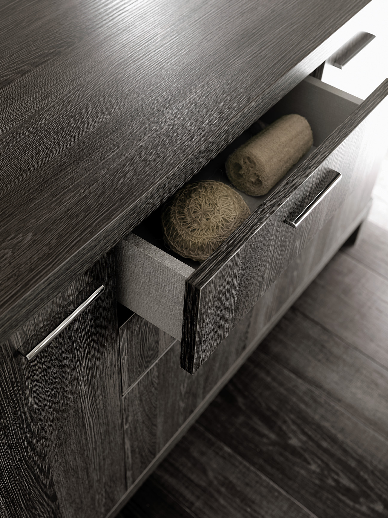 Наиболее укомплектованная модель из серии «ET-NO». Она представляет собой предмет мебели с двойной дверью с автоматическим доводчиком и хромированными ручками, а также тремя самозакрывающимися выдвижными ящиками. Дополнительно в комплектацию может входить раковина белого цвета с хромированным смесителем. Доступно несколько вариантов исполнения мебели – белая лиственница и натуральный венге. Каждый из цветов смотрится гармонично, благородно и универсально. Также покупатель может самостоятельно выбрать тип ножек – деревянные или из хромированной стали.