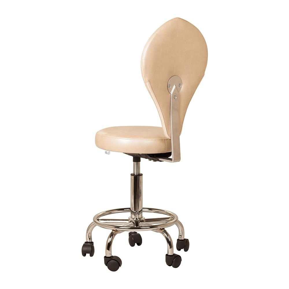 Изысканный дизайн сочетает в себе функциональность и практичность, которые так важны в работе мастеров индустрии красоты. Сидение табурета круглой формы с высокой спинкой в форме лепестка. Обивка из прочного кожзаменителя, устойчива к дезинфицирующим и моющим средствам. Габариты: 35(Ш) x 56(В) x 41(Г)
