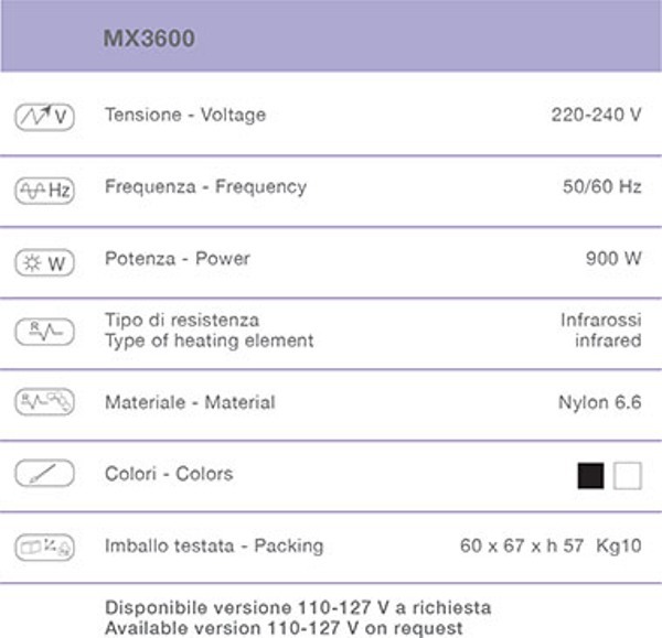 Климазон "MX 3600 ELECTRONIC" - используется для ускорения процесса окраски, завивки и лечения волос. Климазон оснащён таймером, терморегулятором, 5 неподвижными инфракрасными лампами которые включаются по отдельности. При заказе изделия на кронштейне: рекомендованная высота крепления - 190 см (от пола).