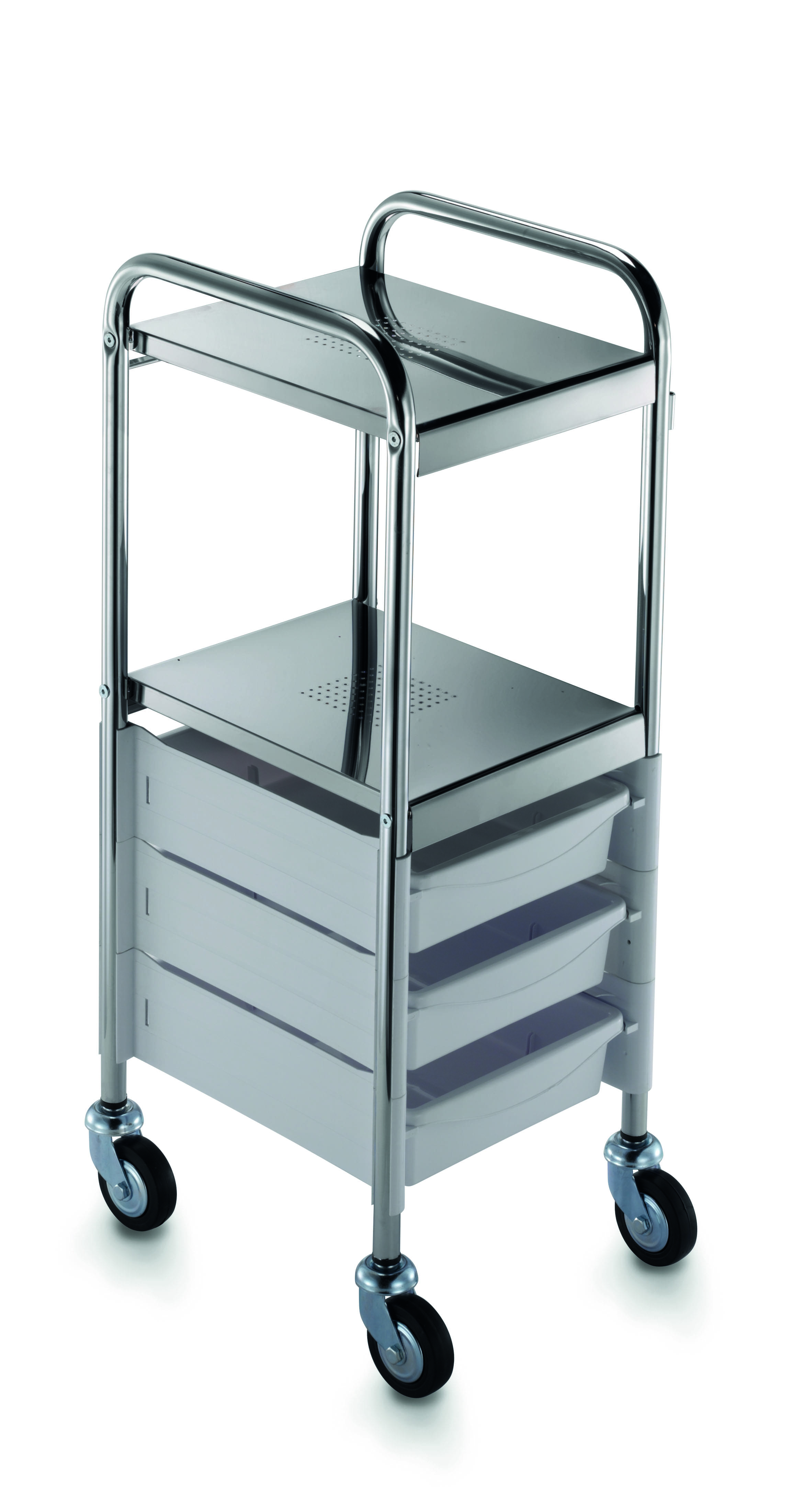 Тележка парикмахерская выполнена из пластика, на колесиках, с выдвижными ящиками. Полки покрыты хромированным металлом. Размер (ДхШхВ): 49х49х88 Цвета: черный, серый, белый.